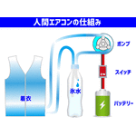 とてもシンプルな構造で、壊れにくい。毎日安定して使える人間エアコン!ポンプを使って冷えた水を循環し、着衣内を循環する仕組み。とても着心地の良い薄い着衣が心地よく、着用していることを忘れさせてくれます。