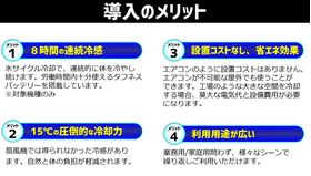 下着として着用するだけで熱源のあるボイラー室や、物理的にエアコンが不可能な溶鉱炉、タイベックをを着て全身フルカバーする場合などにも強力に体温を冷却することが可能です。