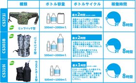 3種類(500ml、1L、2L)のボトルを使用可能。専用設計された2Lボトルを使用することで、小型化に成功。また、従来の市販ペットボトルも使用することができます。(市販ペットボトルは別途、クイックチェンジャー(追加)を使用することによって、使用できます。)重量コントロールは2Lボトルの水量によって調整が可能です。