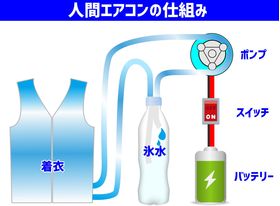とてもシンプルな構造で、壊れにくい。毎日安定して使える人間エアコン!ポンプを使って冷えた水を循環し、着衣内を循環する仕組み。とても着心地の良い薄い着衣が心地よく、着用していることを忘れさせてくれます。