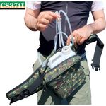 写真ではCS351iとショルダー付き腰ベルトを装着してみました。体の腰裏部分に装着物が無い場合(あるいは、腰部分の荷物を移動させた場合)到着してみて特に動きに支障が出そうな感じはありませんでした。道具がたくさんある方も、ケースバイケースで必要工具を絞るなど、工夫次第で十分人間エアコンを使用できそうな感じです。暑さのリスクと安全のリスク、作業工具の持ち運び&作業利用を実現しています。